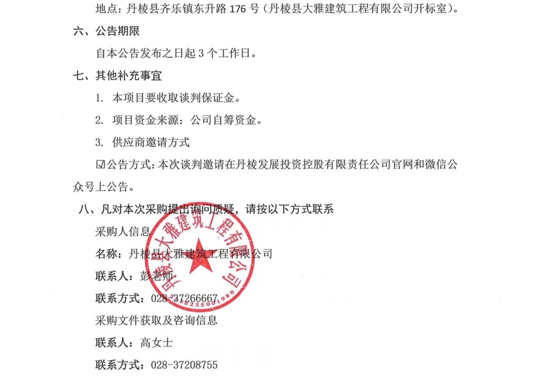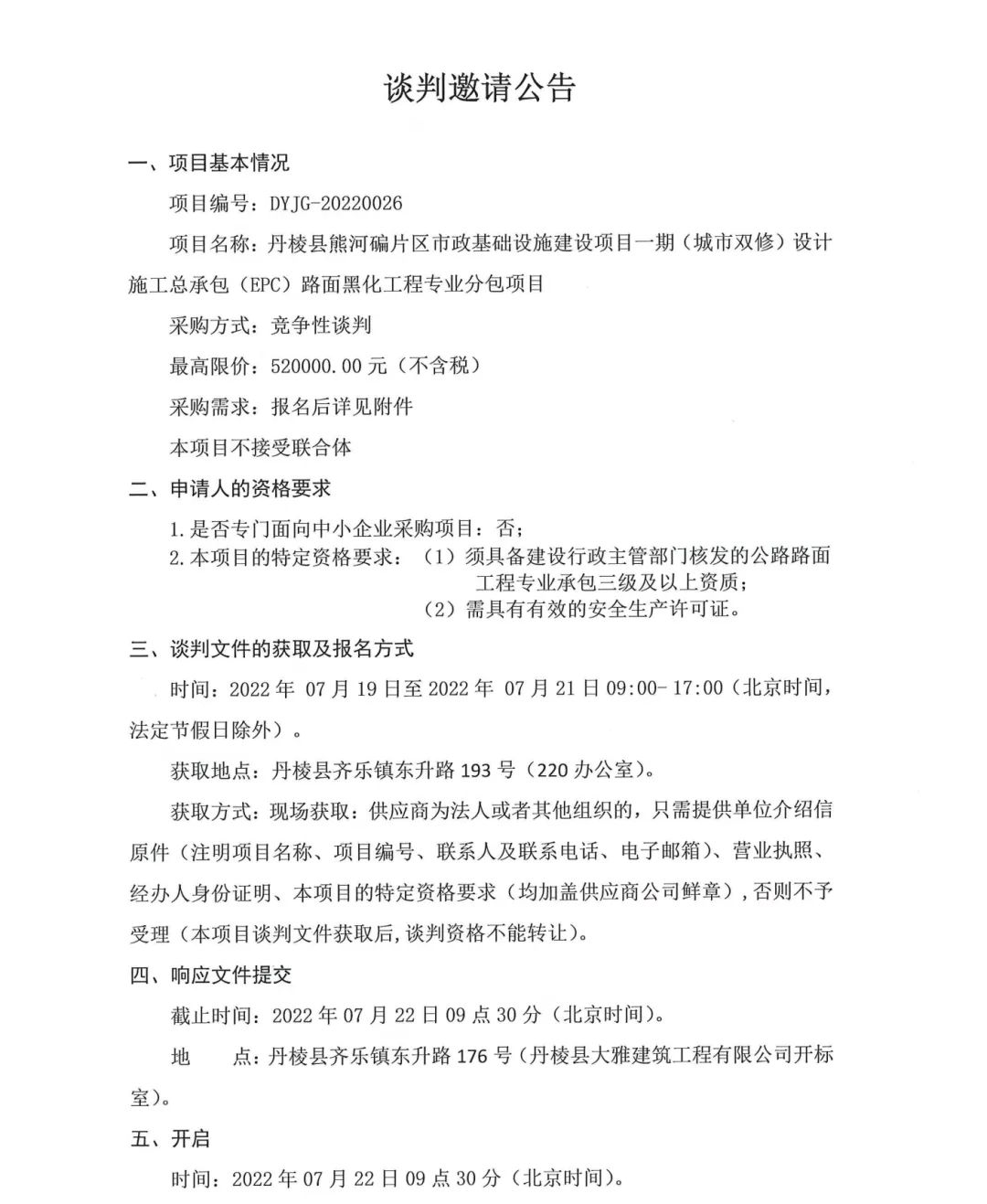 丹棱縣熊河碥片區(qū)市政基礎(chǔ)設(shè)施建設(shè)項目一期(城市雙修)設(shè)計施工總承包(EPC)路面黑化工程專業(yè)分包項目談判邀請公告
